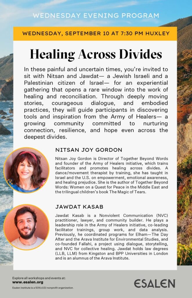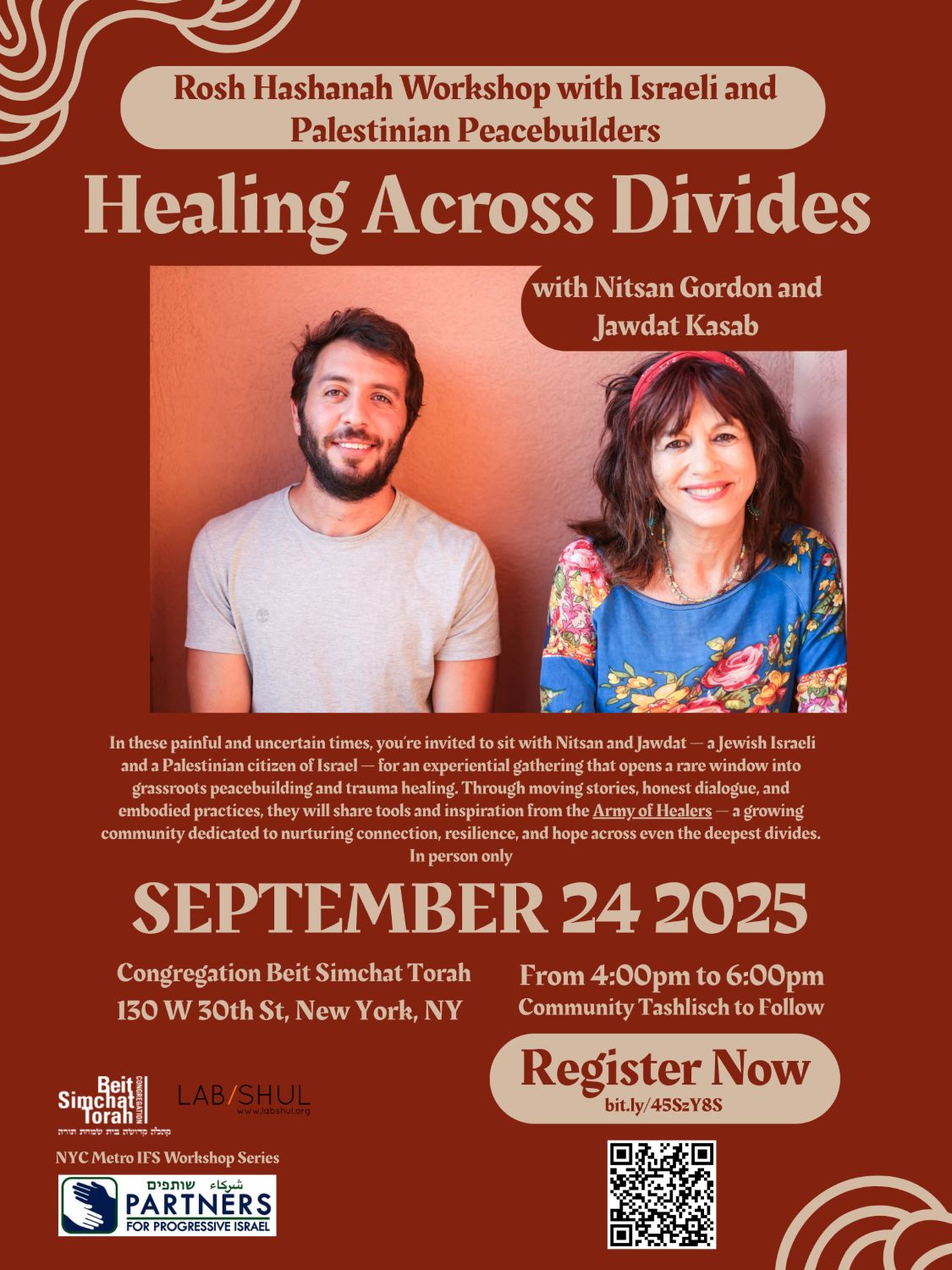 I recently attended Nitsan and Jawdat’s Healing Across Divides workshop in New York City and am deeply grateful I did. With clarity and care, they guided our group through storytelling and dialogue that opened hearts and built genuine connections. I left with a deeper understanding of both Israeli and Palestinian perspectives. In this painful and polarized time, their work feels essential — helping to heal divides and nurture the possibility of peace.